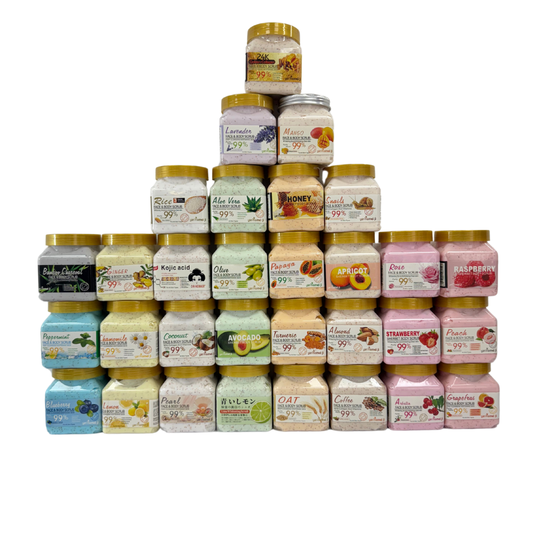 Crema exfoliante facial y corporal de 350g. Hay variedades de cremas exfoliantes como lo son: Frambuesa, Pomelo, Durazno, Fresa, Arbutina, Rosa, Café, Almendra, Albaricoque, Baba de Caracol, Mango, Colágeno Dorado, Avena, Cúrcuma, Papaya, Miel, Lima, Aguacate, Oliva, Aloe Vera, Lavanda, Perla, Coco, Ácido Kójico, Arroz, Limón, Manzanilla, Jengibre, Arándano, Hierbabuena, Carbón Vegetal de Bambú.